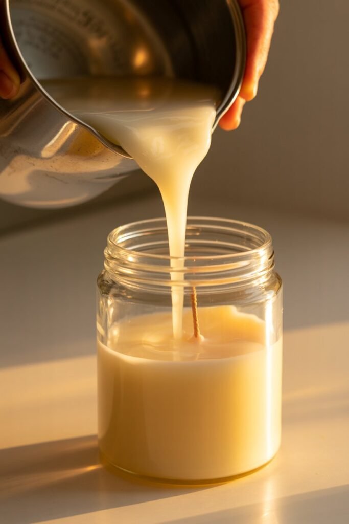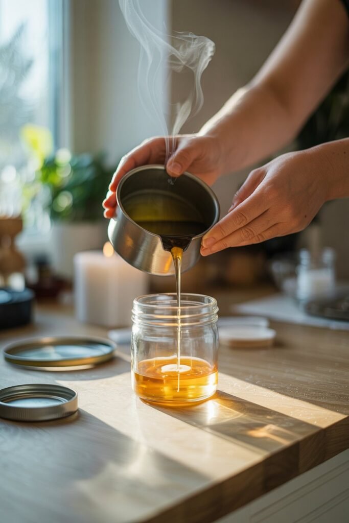 I pour slowly into the container, keeping the wick centered. Then I leave the candle completely alone. This part is important. Moving or touching it while it cools can cause cracks or frosting.