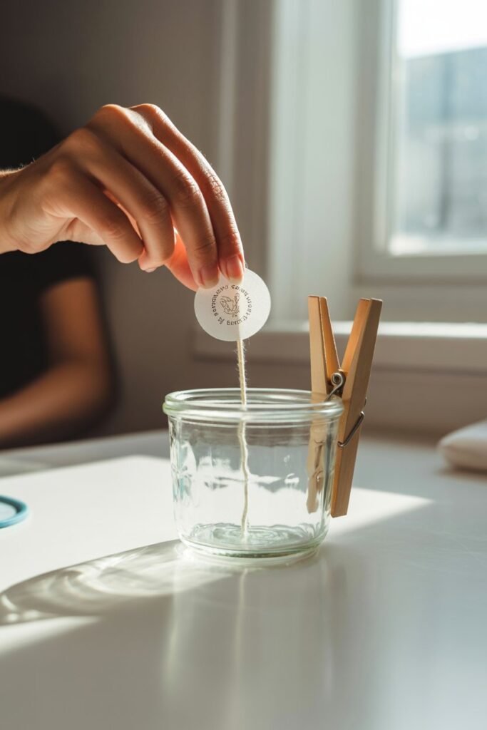 I always start by setting up my containers before melting any wax. I place the wick in the center of the jar and secure it using a wick sticker or a small dot of hot glue. Then I straighten the wick and use a clothespin or wick holder to keep it upright.