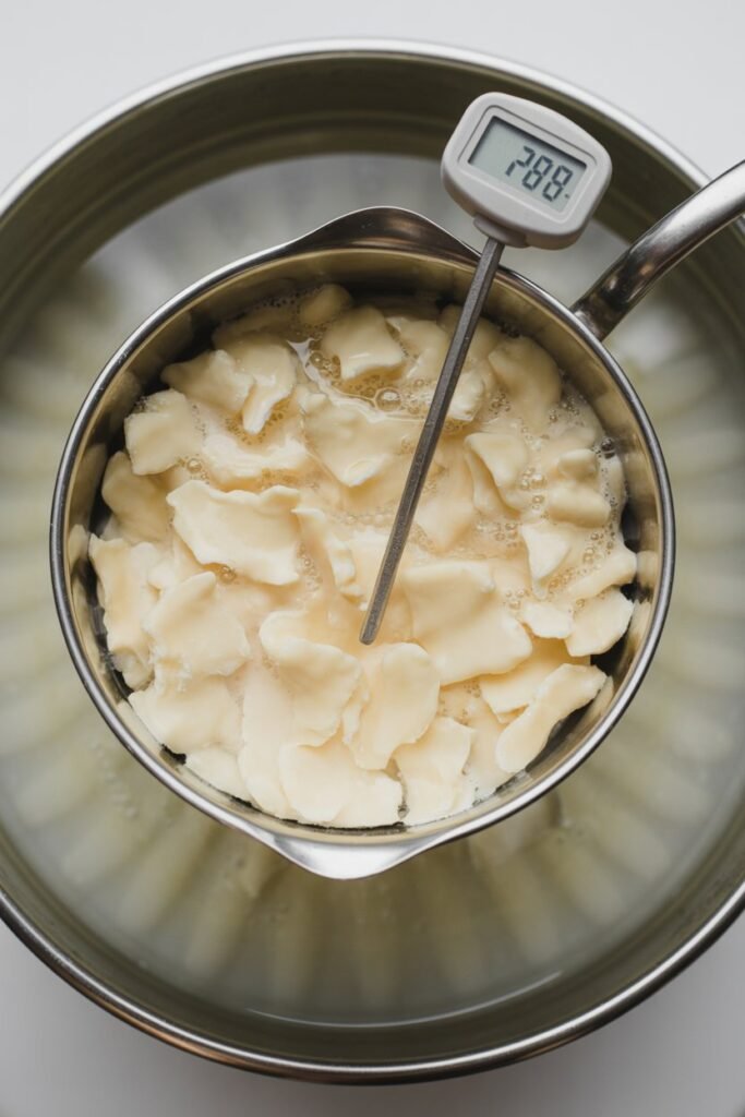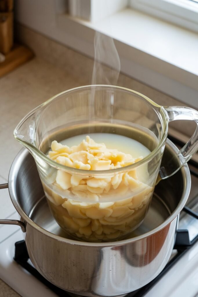 I melt the wax using a double boiler method. I place the wax in a heat-safe pouring container and set it inside a pot of simmering water. I stir occasionally and monitor the temperature until the wax is fully melted and smooth.